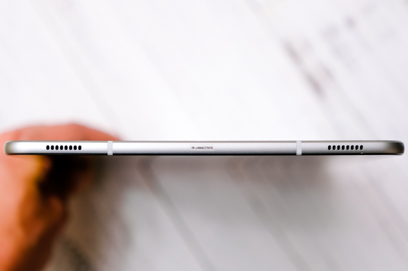 而這次的喇叭,不僅是橫向畫面會有左右聲道的音場,一般的平板就算有與 Galaxy Tab S3 相同的喇叭位置,當你轉成直的時候,大多是左聲道一樣從上方出來,右聲道則是下方,但在 Tab S3 上,這次對於喇叭可是下了不少功夫,就算你轉為直向使用時,喇叭的左右聲道會自動調整方向,因此不論是橫向或直向,這立體聲的感受依然是不會有差異的。