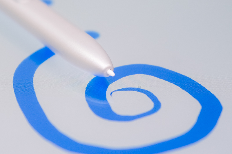 筆尖為 0.7mm,擁有超高的 4096 階感壓,會因應你手的力道有非常細緻的筆畫粗細及顏色深淺等,特別是用在繪圖更能展現出不同的筆畫細節,這次還增加傾斜偵測,比如原本我們如果想要畫出淡藍色粗線條,就得顏色一開始就選好淺藍色,這樣當用力畫粗線條時,色彩才會剛好,但現在只需要傾斜筆尖輕輕的話就可以輕鬆的直接用一般藍色表現出粗線條淺藍色(當然還是得看筆刷種類)。