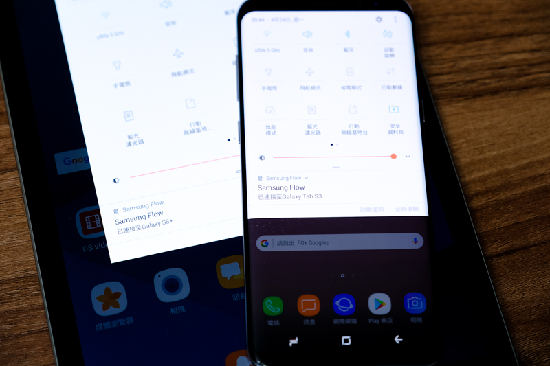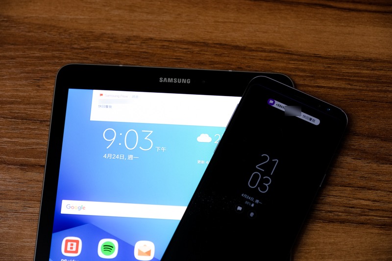 全新的 Samsung Flow APP 可以讓手機、平板及電腦串連起來,這邊阿湯將 Galaxy S8+ 與 Galaxy Tab S3 連結起來,就可以同時收到二台設備的通知以及互相傳送檔案。