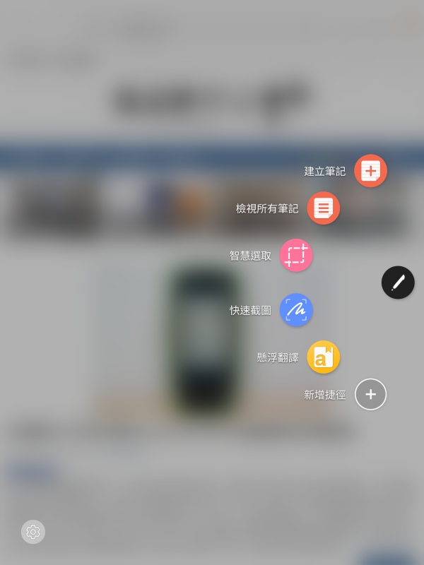 只要有用過 S Pen 的朋友,應該對於這「感應快捷環」都不陌生,當你將筆靠近螢幕,在任何畫面都會出現這個快捷環圖示,點一下就可以選取功能。