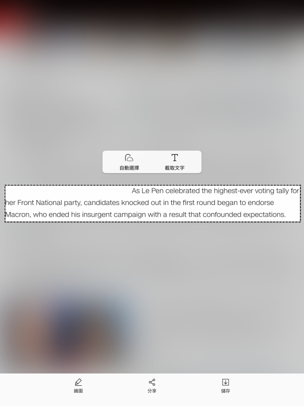 智慧選取,可以直接選取頁面上任一範圍,像是網頁、照片、或者任何畫面都可以,選擇想要截取的文字,可以直接辨識後取出來額外使用。