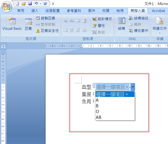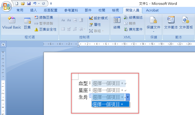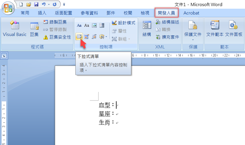 接著就到開發人員區,將滑鼠游標移到要插入清單的地方,點「下拉式清單」