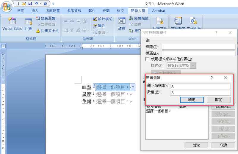 在選項中填上顯示名稱和數值,基本上一樣就好沒什麼差別,點確定新增。