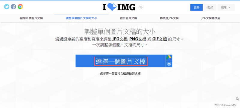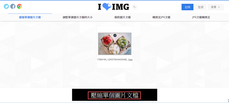 首頁就顯示了網站的五大功能,點擊要用的功能就能對圖片進行編輯或是轉檔,來試試壓縮圖片。