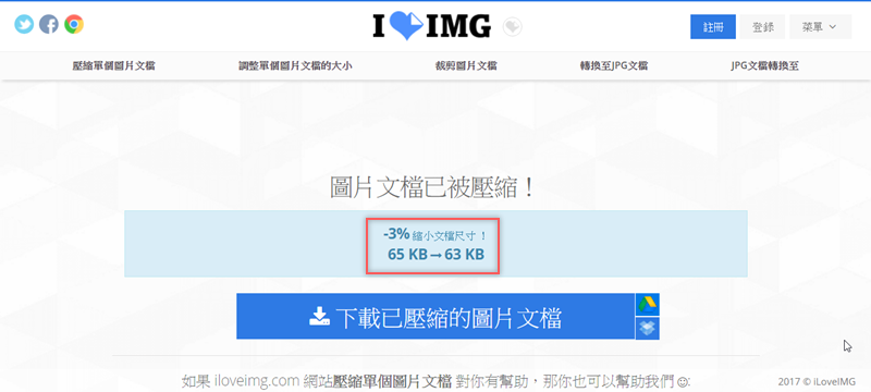 由於預設是以保持檔案的品質來決定壓縮程度,所以跑出來的結果是固定的,像這個檔就是由 65KB → 63KB,只縮小了 3 %。