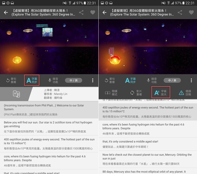 點進影片,預設中英字幕同步播放,也能改成適合自己的模式,例如將字體放大等等。