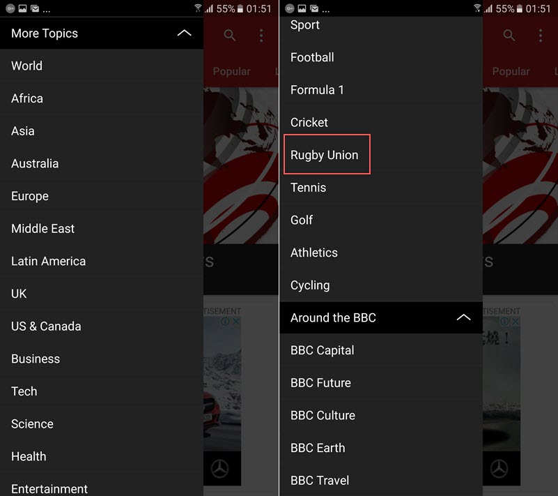 點開左方功能列可以有很多新聞類別可選,非常多元,看看「Rugby Union」。