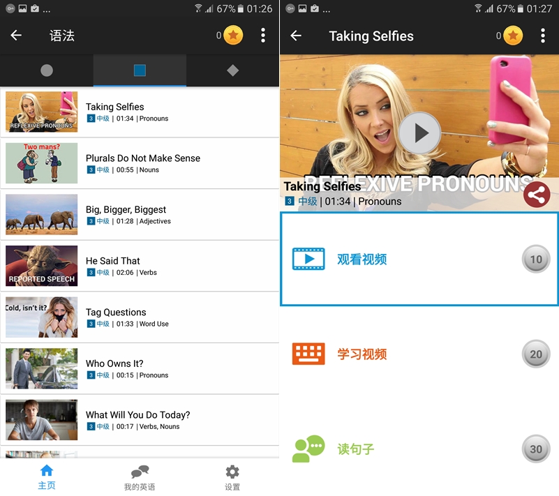 影片類別很多,基本的學術、商務、社交等都有,還有針對語法、發音與溝通的,就從語法這裡點觀看視頻開始。