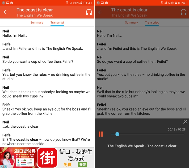 然後到「Transcript」就有文字內容跟語音同步出現,跳出 APP 也會在後台播放。
