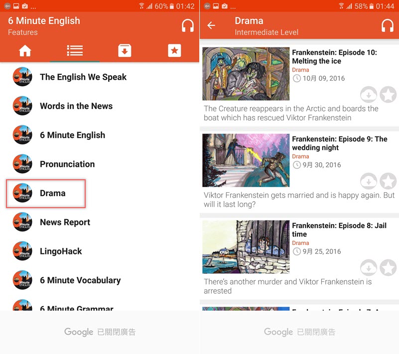 分類也有十三種可選,點「Drama」進去就會出現相關的主題,一樣可以用上面的方式來閱讀學習。