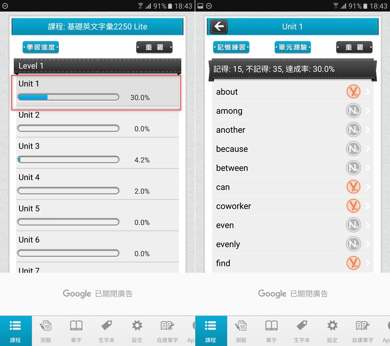 知名的賴世雄英語也出了 APP,阿湯有先學了一些內容所以在 Unit 1 會有進度在,但很多單字還沒讀過所以達成率很低。
