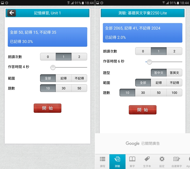 記憶練習與測驗的部分都可以調整朗讀次數、作答時間、範圍與題數,再點開始即可。