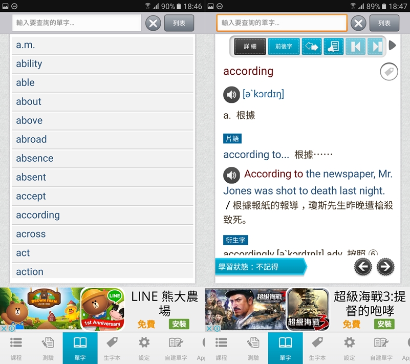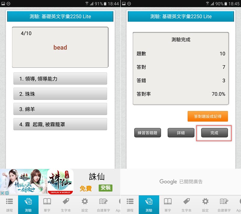 APP 會唸出單字讓你從下面四個選項作答,結束後可以將答對的單字設成「記得」,這樣就會累積不少學過的單字,答錯的也可以再答一遍。