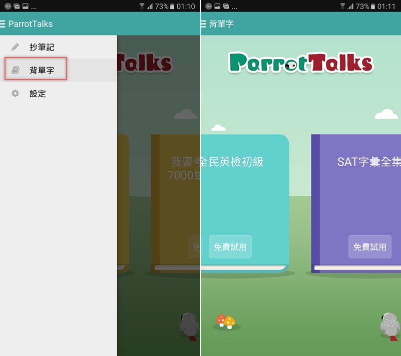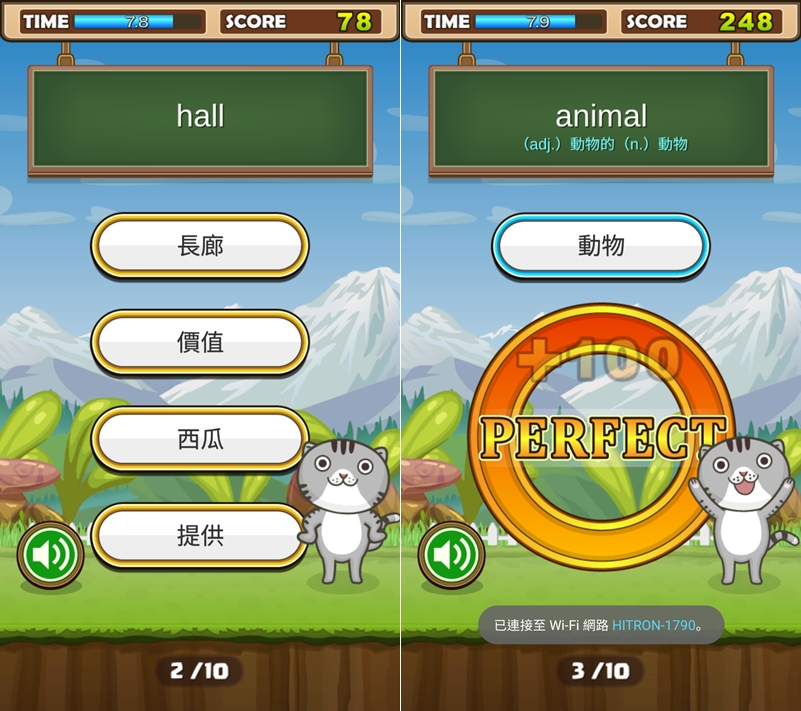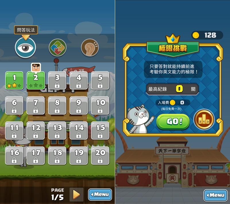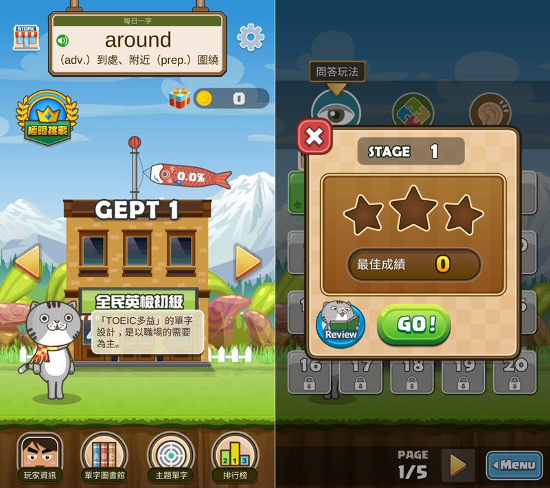如果覺得一板一眼的 APP 壓力很大,可以從遊戲來學習,像這個就是以卡通化的方式由貓咪帶著你一起學,也是有英檢、多益、托福的字庫可選,由問答玩法開始吧。