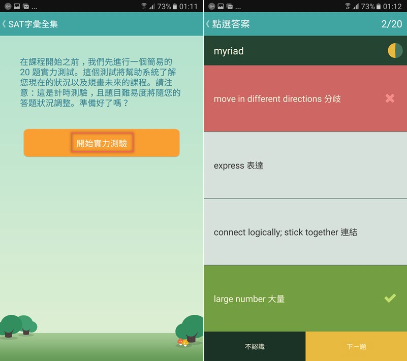 測驗的部分可以選單元或程度來出題,再設好題數和順序就可以開始作答了。