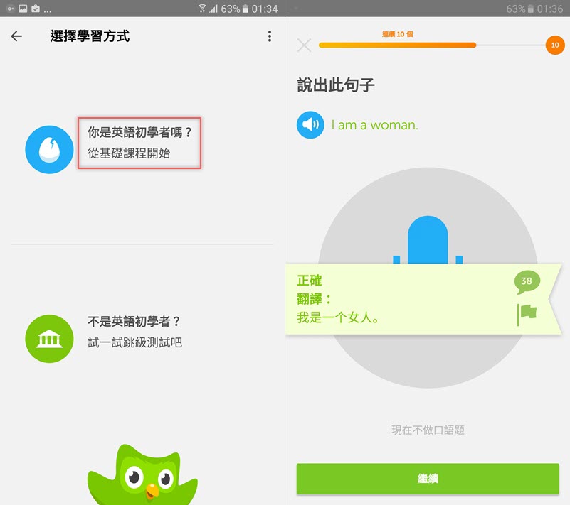 這邊阿湯本來是選「不是英語初學者」,但進入後還要考跳級測驗,覺得麻煩就從基礎課程來示範好了,內容有看圖選擇、填字句或用說的,真的是非常基礎的內容,大家還是經由跳級測試到更高級比較好。