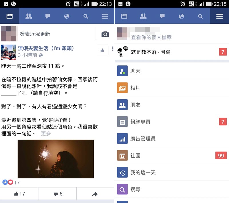 先帶大家看一下它的介面,APP 下載速度很快,登入後功能列都在上排,右上角點開可以連到個人檔案、聊天、相片等,相對簡潔許多。