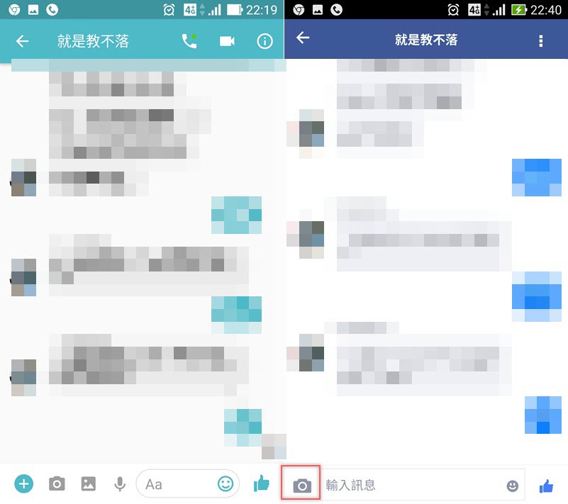左圖一般版該有的功能都有,右圖輕量版只能輸入文字和貼圖,點左下角相機圖示可以拍照或傳照片,不能通話、之前介紹的地點分享也沒有,但優點是 Messenger 變成內建的,不用連到 Messenger APP 開啟。