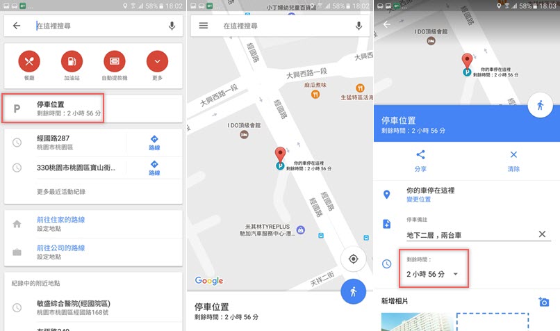 點進來繼續編輯,可以備註停車場名稱、車位號碼等詳細資訊,如果不是停車場也可以寫靠近哪個東西,還可以加入周遭相片,重要的是可以計時,一般停車場都會標示停多久免費、或是使用什麼卡可以停多久,現在只要在這裡設定,就會幫你倒數計時,有的停車場超過幾分鐘就會算一小時的錢,有這功能真的蠻方便。