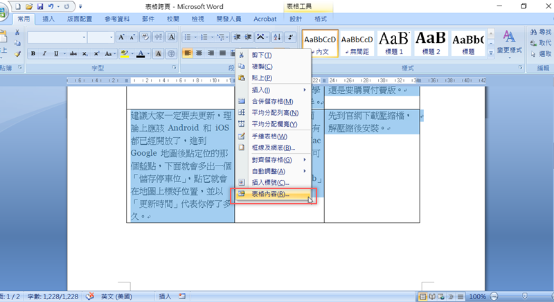 這時候只要將表格全選後,按右鍵「表格內容」。