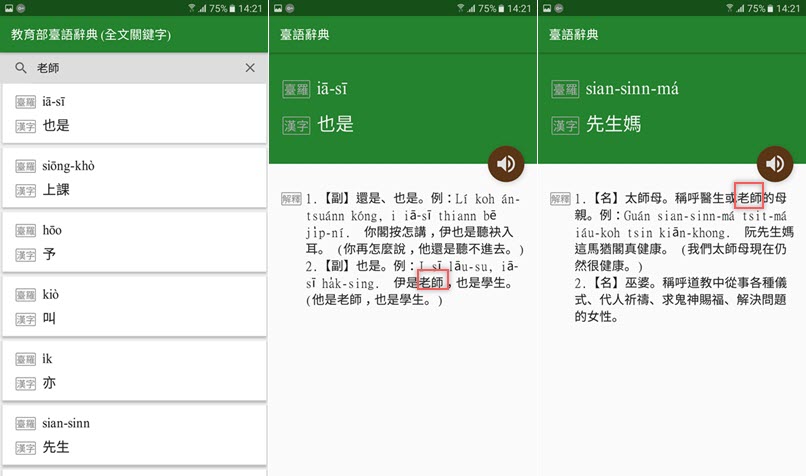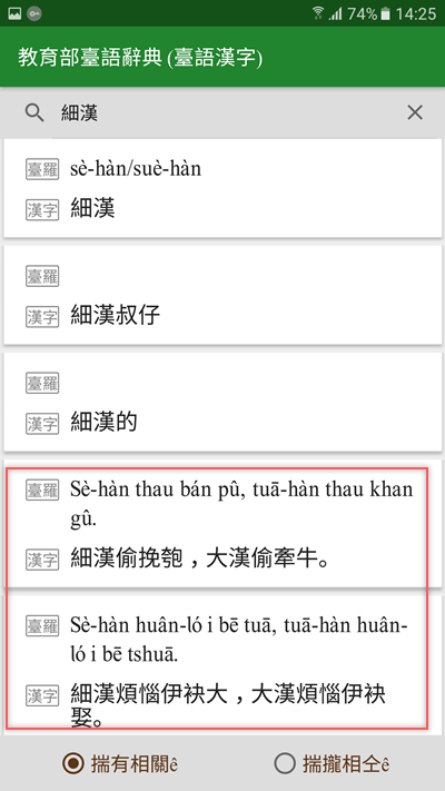 對應的華語漢字就比較好理解,華語怎麼念就打上去,解釋的部分會連臺羅拼音、臺語漢字都一起顯示,等於一次可以學三種表現方式。