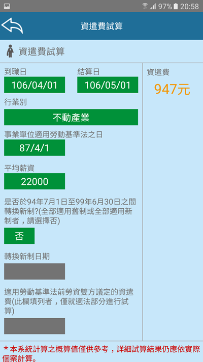 阿湯就一步步帶大家看,首先是資遣費,輸入到職日與結算日,再輸入行業別下面就會自動跳出事業單位適用勞動基礎法之日,最後輸入薪資,如果碰到新舊制轉換期就再繼續填,沒有的話,答案就是右邊的數字。