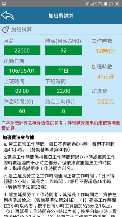 其他像是勞基法相關規定都可以在這裡查詢,而且都有在持續更新,或者從相關連結的地方到網站獲得進一步的資訊,阿湯是覺得這 APP 蠻方便的,不用到處查或是自己亂算算錯,缺點就是加班費試算目前只能一天天算,如果要整月算可以用阿湯寫過的