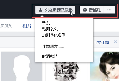 確認一下吧,正常來講,當你送出交友邀請後,你在對方的首頁看到的情況應該是「交友邀請已送出」和「發訊息」這兩塊都有出現,你可以選擇取消邀請後再發一次(阿湯就曾經重發後對方才看到)。
