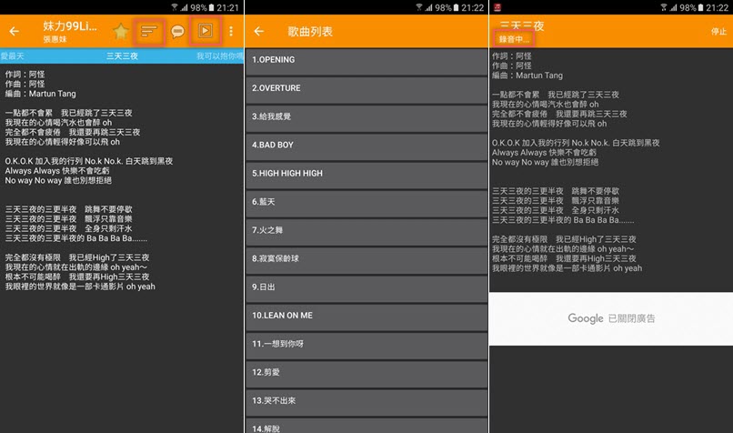 除了歌手和歌詞,也會像歌詞本一樣列出作曲、作詞、編曲者,點上方清單圖示可以看到同一張專輯的所有歌曲,也可以在歌詞頁面左右滑動來切換,上方另一個播放圖示是錄音功能,但阿湯覺得不太好用。