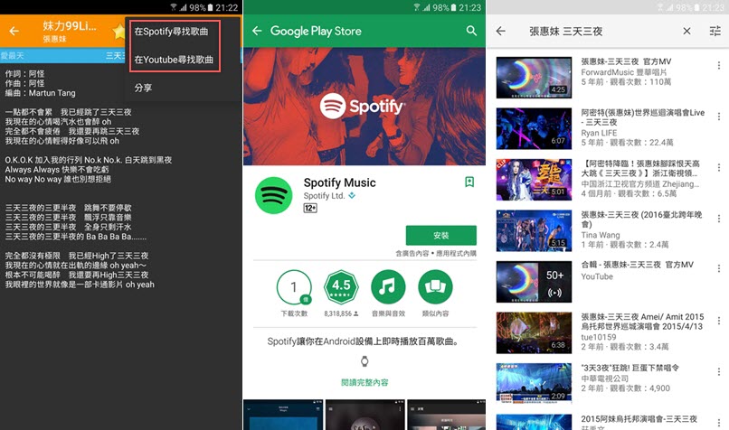 還能直接連到 Spotify 或 YouTube 來搜尋歌曲,或者先從這款 APP 找出歌詞後再到 Spotify Music 來播放。