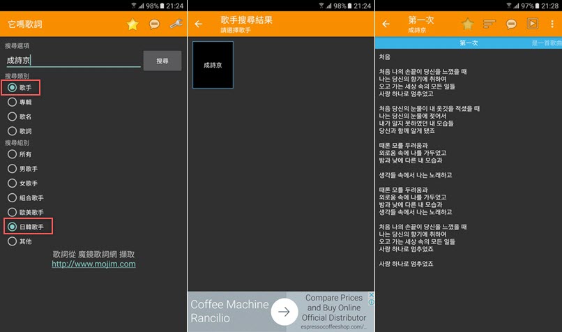 外國歌手的資料就比較少,例如「成詩京」這位韓國歌手其實蠻有名的,但只找到一張專輯,而且只有韓文歌詞,如果需要中文翻譯就要自己上網找了。