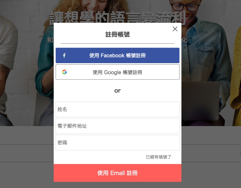 帳號註冊可以透過 Facebook 或 Google,不想連結社群帳號也能獨立用 Email 註冊。
