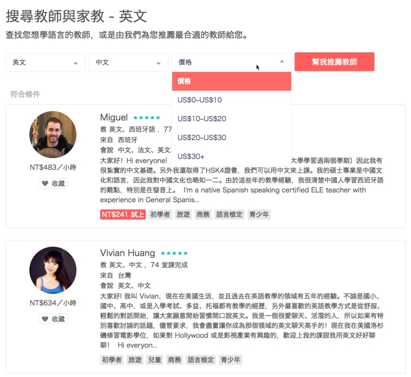 當你做了語言的初步篩選之後,還可以再進一步的針對老師會說的語言及價格進行篩選,更精準的找出你所需要的老師。