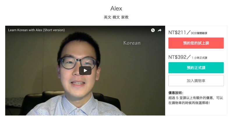 而購買正式課程時,可以選擇一次購買 1 堂、5 堂或 10 堂,原則上愈多堂課愈便宜,這些價格都是由老師自己定制,所以每位老師的價格都會不同,你也可以依自己的預算篩選適合自己的老師。