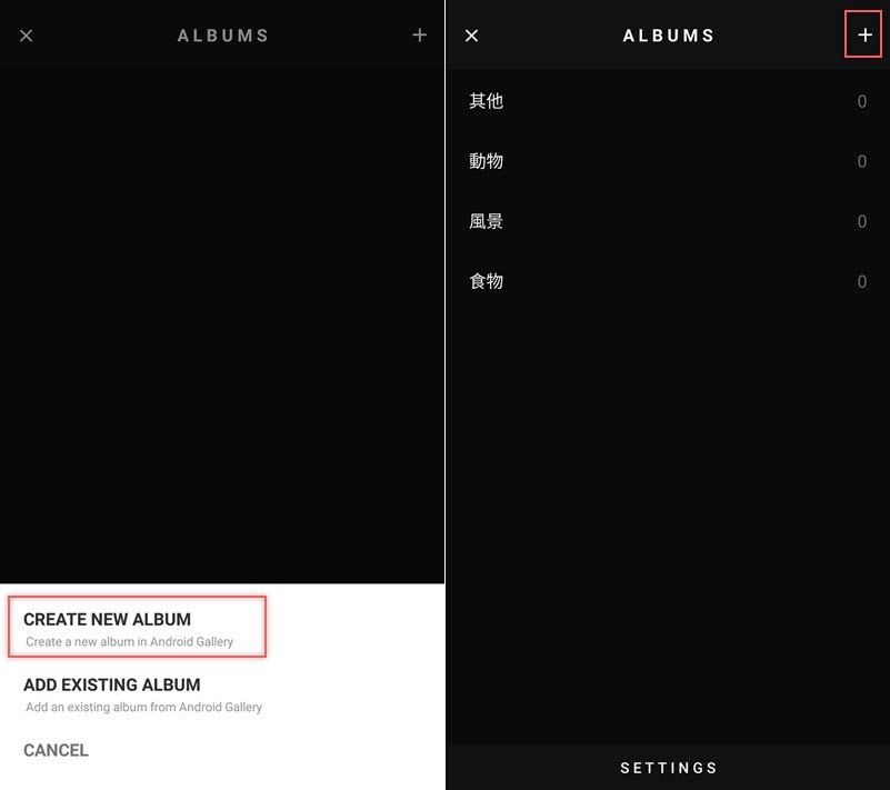 點右上角「+」再點「CREATE NEW ALBUM」來建立相簿,可以多建幾個類別。