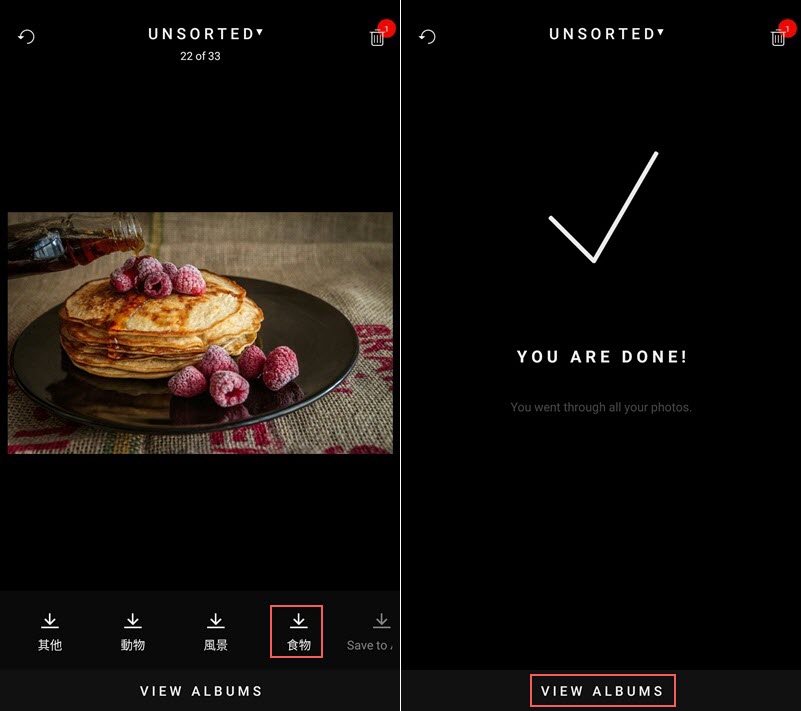 再回到相片,點分類的圖示就會幫你歸進去,然後自動跳下一張,速度很快就整理完成,再點「VIEW ALBUMS」查看歸類的狀況。