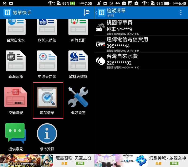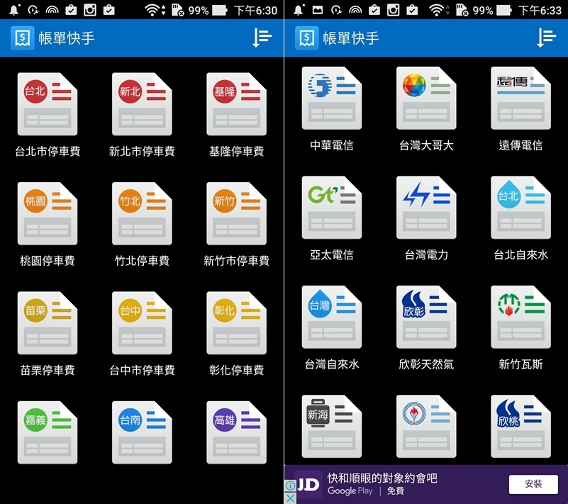 這個 APP 目前雖然只有 Android 版,但內容陸續還在更新中,官方回應問題也很確實,iOS 用戶可以期待看看。打開首頁,所有可以查詢的帳單一目瞭然,各縣市停車費都有,台水台電帳單也有,電信業的部分就是幾個大間的,瓦斯公司也有一些尚未加入。
