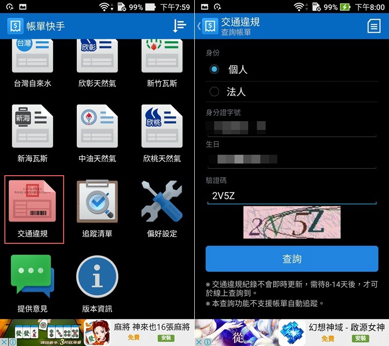 交通違規這裡就真的是查拖吊費的地方,輸入個人資料與驗證碼就知道有沒有被開的紅單還沒繳費,但這項功能和電費、亞太電信費目前還不能設定自動追蹤,要自己注意。