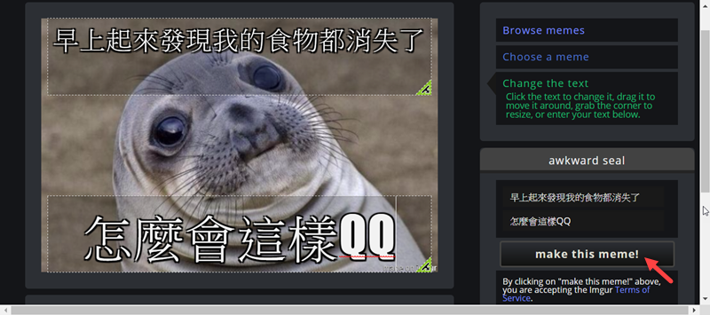 隨便點一個圖,編輯文字後,點「make this meme」。