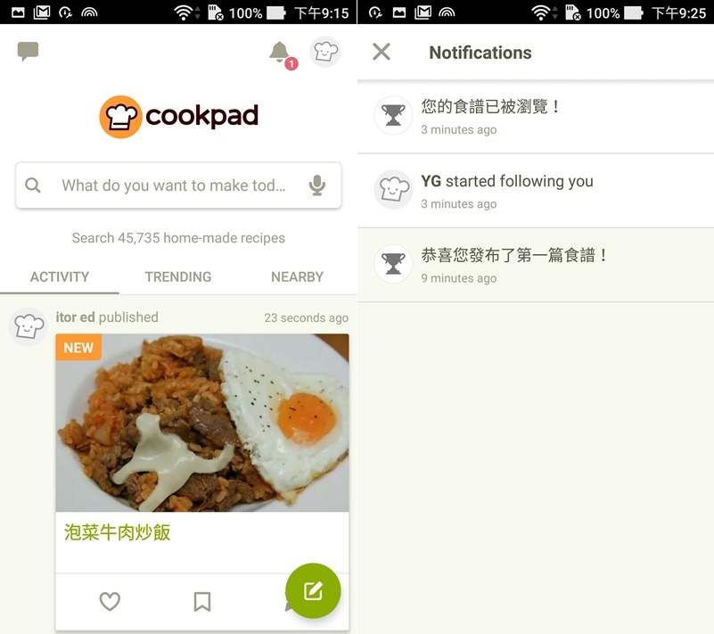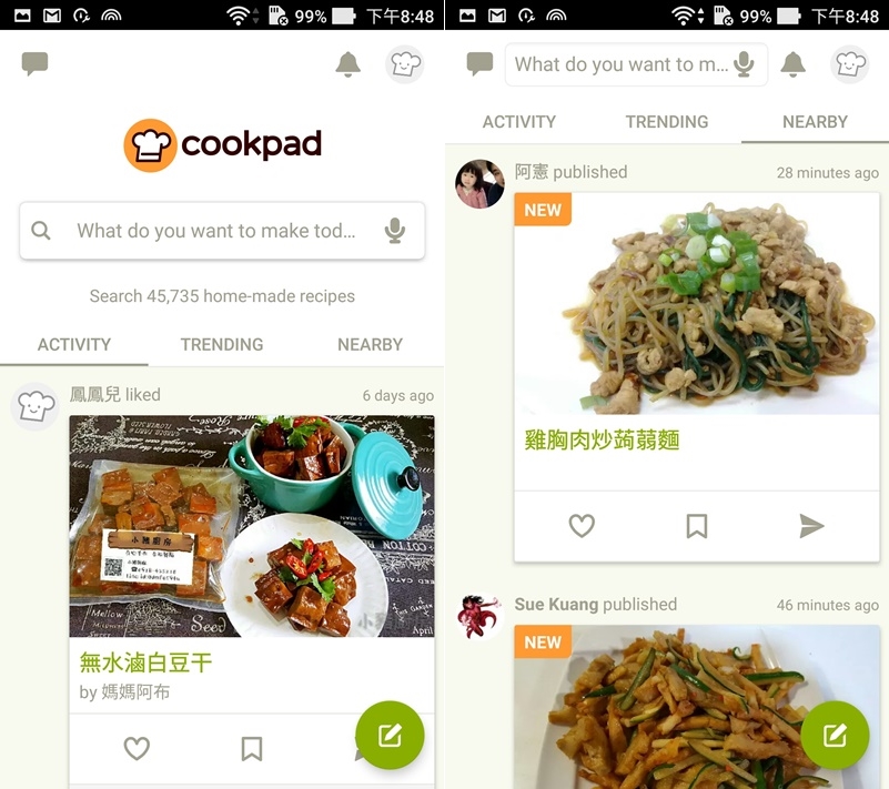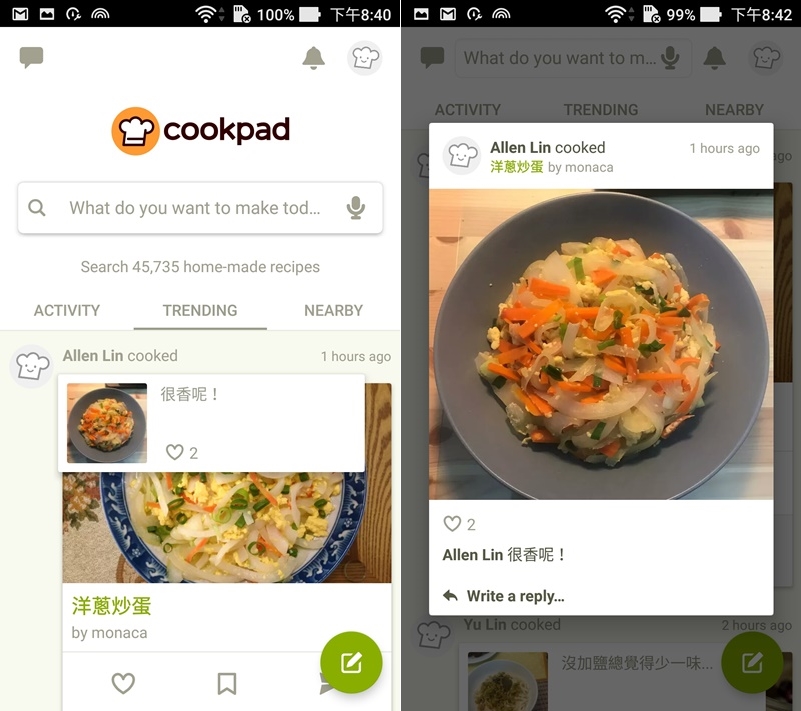 進入主畫面先看到的是網友們對於食譜的最新回應,這裡跟「Cookpad」網站是同步的,所以你看到的討論和食譜都是一樣的。