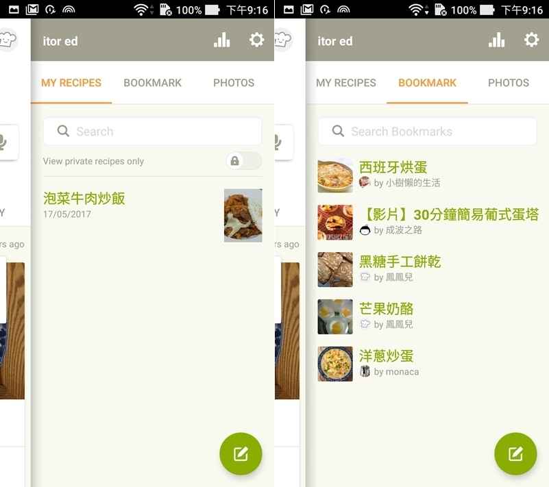 點右上角廚師帽圖示就會看到發表過的文章,和加入收藏的食譜,下次不知道要煮什麼就先從這邊找吧。