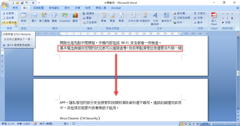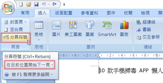 因為分頁符號的功能是「在目前位置開始下一頁」,所以滑鼠游標要先移到要設定的那一行,假設是「基本電池…」這一行。