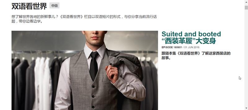 原來是以雙語短片的方式分享流行話題,聽聽這個西裝店的故事吧,點「Suired and booted 西裝革履大變身」。