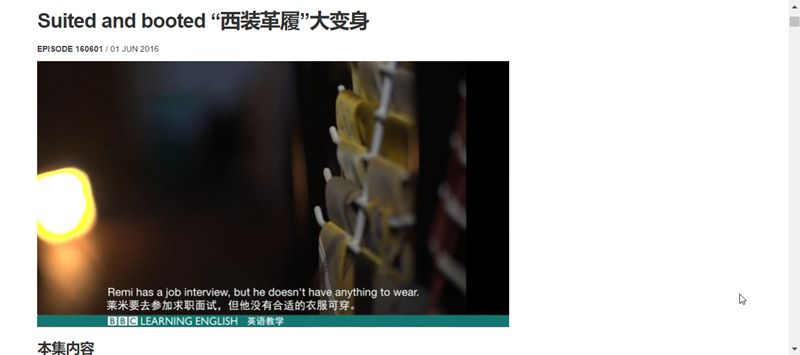 內容是一個 45 秒的影片,純英語搭配中英字幕,講一個慈善機構給經濟不佳的求職者提供西裝,讓他們更有自信的報導。