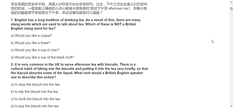 英語小測驗主要是考文法和詞彙運用,難度只有中級,如果有注意會發現目前看到的單元都是中級的內容,一般程度都可以懂。