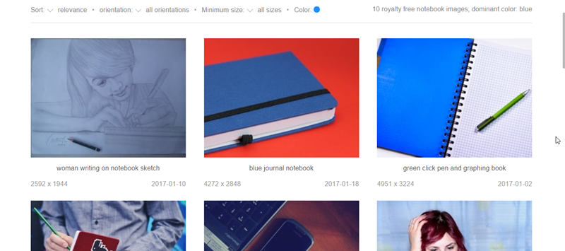 從筆記本類別再過濾出 10 張「Blue」相關的圖片,有的畫面並沒有明顯的藍色只是畫面偏淡藍灰的感覺也會列出來,如果要做 PPT 檔或是一些設計需要用到多張圖片組合,不妨用顏色過濾來製造出風格的整體感。