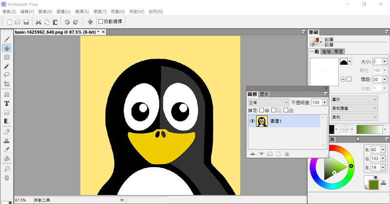 成功變成繁體中文了,如果有用過 Photoshop 就會發現它們的介面長的很像,左邊是選取、裁減、筆型工具等基本功能,右邊是筆刷、色彩、圖層等視窗,開啟一個檔案來玩玩看。