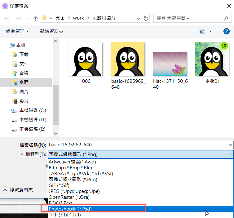 最後儲存,除了有軟體本身的檔案外,還有 GIF、JPEG、PNG、BMP、TIFF,以及 Photoshop 專屬的 PSD,等於說你這邊編輯好了,以後可以再放進 Photoshop 進階修改。