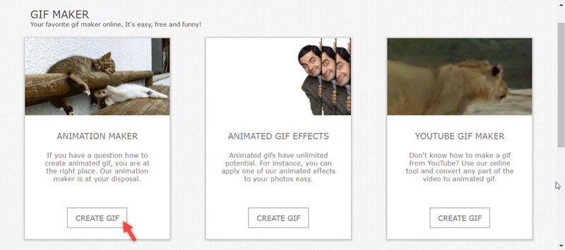 網站首頁就顯示了三大功能,照片製作 GIF 圖、特效套用、從 YouTube 影片截取,先來用第一項,點「CREATE GIF」。