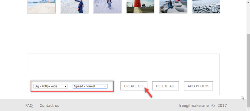 往下選擇尺寸,有 100px、125px、300px、400px 四種大小,再選擇速度,從慢到快有五段可選,如果不滿意可以再刪掉或增加照片,OK 的話就點「CREATE GIF」。